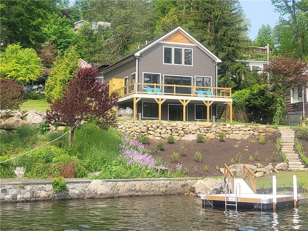 tunning Candlewood Knolls New Construction waterfront home, amazing setting with wide lake views and built with attention to detail with custom craftsmanship. The home has an open concept, soaring ceilings & walls of windows with panoramic lake views. The kitchen is well-designed with a center island, Samsung appliances, & White Quartz counters., a large pantry & built-in bench seating in the dining room. The living room has a warm fireplace, custom built for a 60' TV. There is access to the large Timberteck decking with marine railings, the perfect relax and enjoy the expansive views. The main level has an owner's suite with a custom shower with bench seating. The upper level 2 bedrooms, built-in bunk beds, and share a Jack and Jill bath. The lake-level family room has plenty of room and sliders to the covered bluestone patio and access to the level & lakefront. There is a full bath & plenty of storage. The home has propane heating. The home was professionally landscaped with a bluestone front patio and stairs, and stone stairs to the level waterfront and firepit area. There is also an irrigation system. The home has plenty of parking and easy access & an outdoor shower. The waterfront has a 10x12 dock with an 18 ft. gangway & can accommodate a boat on the left and jetskis on the right. The Knolls community offers a ball field, bocce court, basketball, tennis, clubhouse, & beaches to enjoy. Close to the town center all shopping & schools. Ready for a summer of fun!