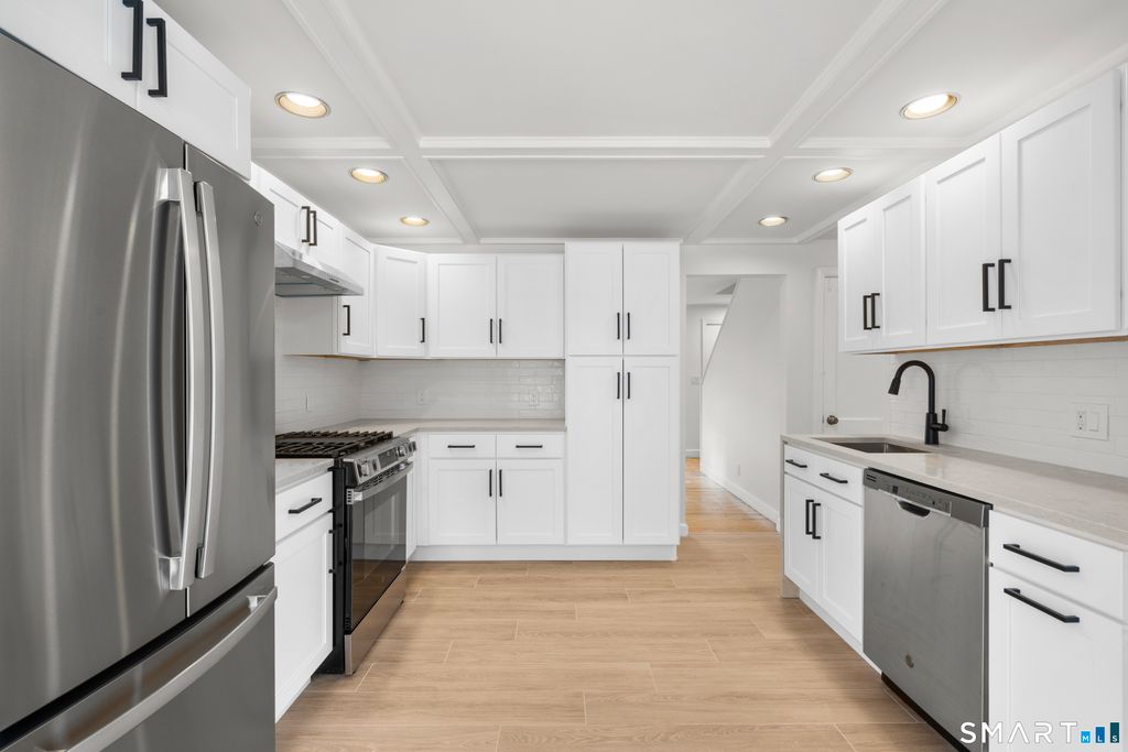 Make yourself at home in this charming & ideally located cape. Inviting entry flows seamlessly into sunny & generously-sized living room. Kitchen completely refreshed, featuring quartz countertops w/bespoke waterfall finish & brand-new gas range & refrigerator. Kitchen opens to bright sunroom/dining room/playroom (you decide!) w/beautiful sliders & picture windows overlooking deck & backyard. Step outside & enjoy plenty of greenspace for play along w/the extraordinary deck - perfect for grilling, entertaining or just relaxing. Inside, both main level BRs feature 2 window exposures, ample closet space & easy access to the modernized FBA. Other highlights include hardwood & tile floors throughout, ceiling fans, recessed lighting & coffered & vaulted ceilings. Upstairs, the spacious BR/office options plus 2 floored eaves storage areas provide flexibility. Amazing LL bonus space serves as home gym/playroom/office w/room for storage, too. Pristine laundry room w/sparkling tile backsplash & attached garage make it complete. The carefully thought-out updates, prime location & walkability make this home incredibly special. 1 min to I-95 & under 1/2mi to Chelsea Piers, Rogers School, NBC Sports, HSS, convenience stores & restaurants. 1mi to Cove Island Beach & Park, Cummings Beach & Park & local grocery. 2mi to Downtown Stamford & Stamford RR as well as Noroton Heights retail center & RR makes errands & commuting a breeze. Come take a look at everything this polished gem has to offer!