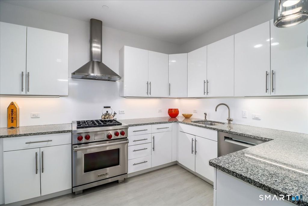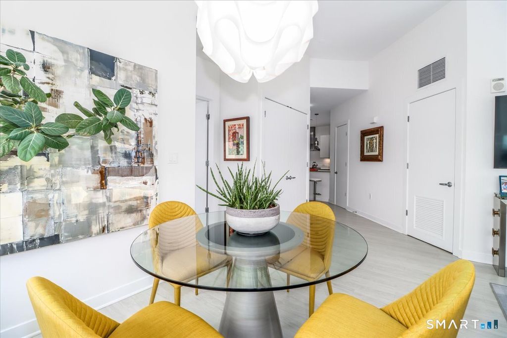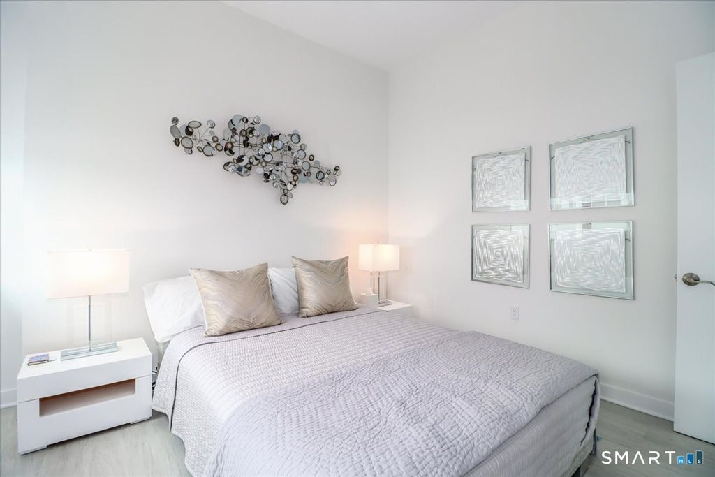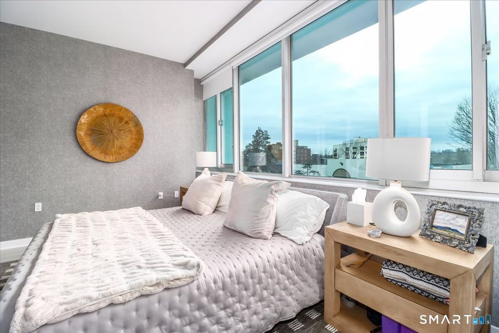 Sophisticated living can be yours in this sunny 2-bedroom, 2-bath flat featuring high ceilings, walls of noise-reducing windows & modern design for easy living & entertaining. This fourth-floor corner unit is filled w/sunlight & showcases sunset views you can enjoy relaxing at home w/family & friends. In fact, the open plan living & dining room has a ceiling that measures nearly 11-feet high & the area boasts expansive windows that span the walls & create double aspect views that fill the rooms w/so much natural light! Designer gourmet kitchen is perfect for the serious home chef. There is abundant sleek white cabinetry, Wolf gas range, SubZero refrigerator, large undermounted sink & Bosch dishwasher ... while expansive granite countertops provide lots of workspace + breakfast bar for casual dining. Primary bedroom has custom outfitted walk-in closet & handsome en suite w/double sink vanity & WI shower, while 2nd bedroom is roomy w/outfitted double closet. Large 2nd bathroom has tub w/shower & both bathrms have lustrous modern vanities. This lovely unit has gas cooking, nest thermostat, heat+CAC cooling water incl'd in common charge+2-deeded garage spots-Feature sheet tells all. The building has a well-equipped gym, inviting Community Room, temp-controlled wine cellar & SELLER WILL PAY $13,248 roofing assessment! Conv location nr shops-just mins to Scalzi Park for tennis & to Stamford's vibrant downtown. Now's the time to live the easy lifestyle you deserve in true splendor!