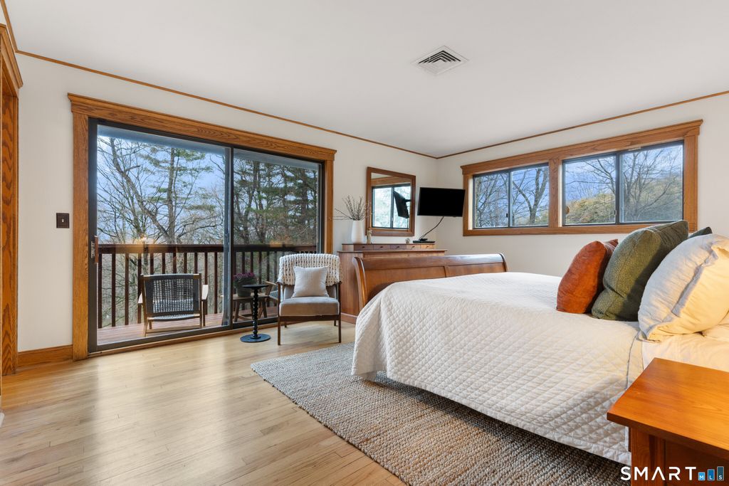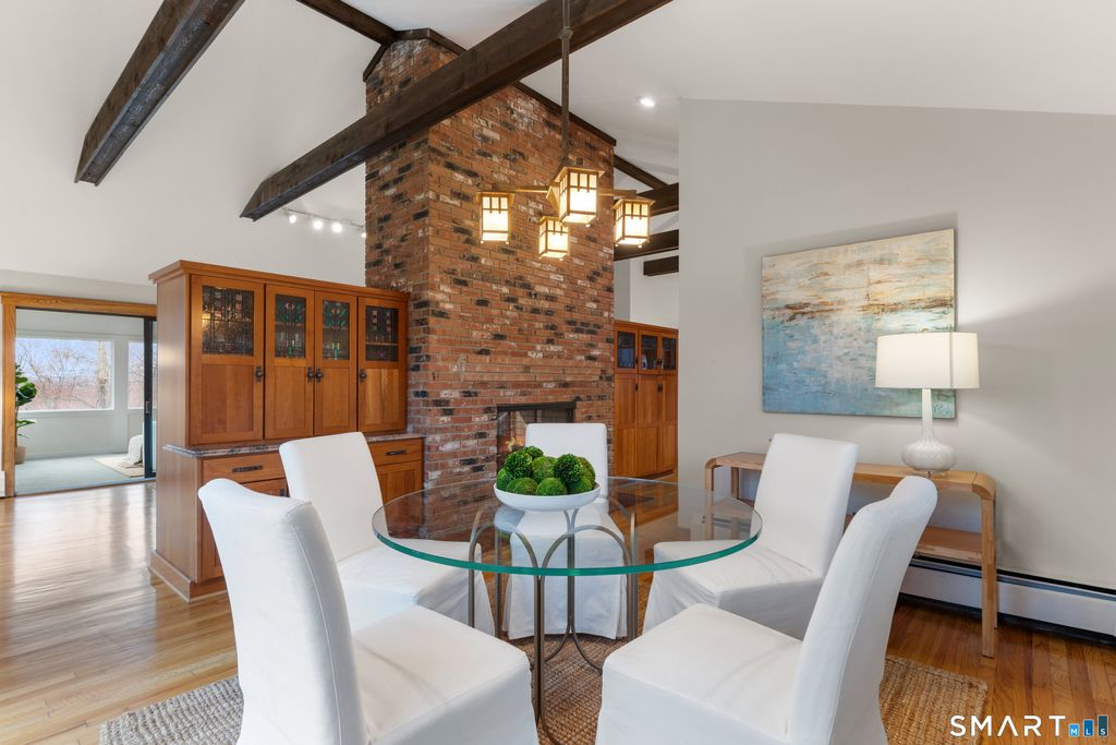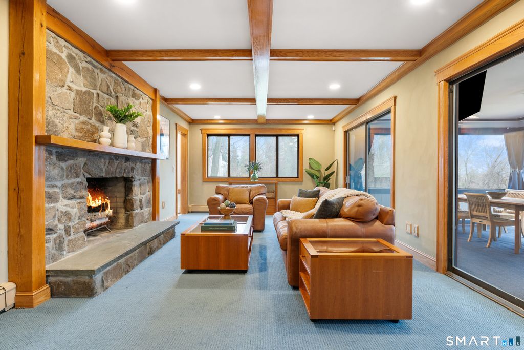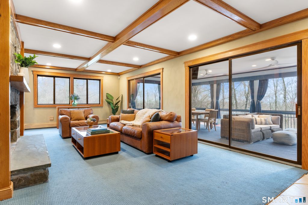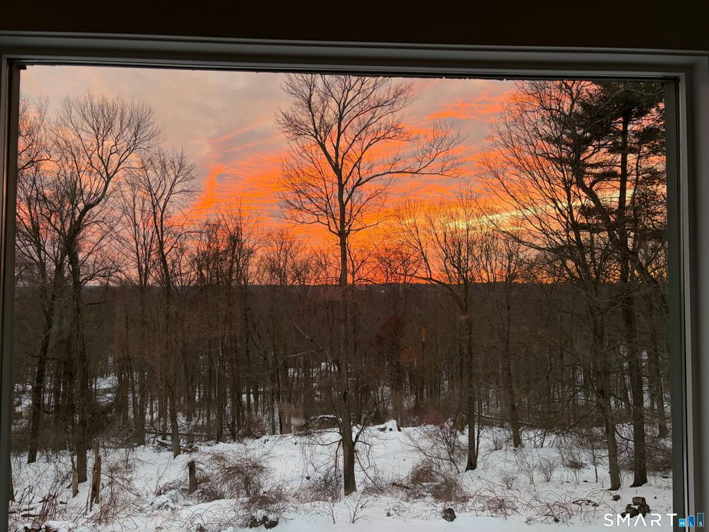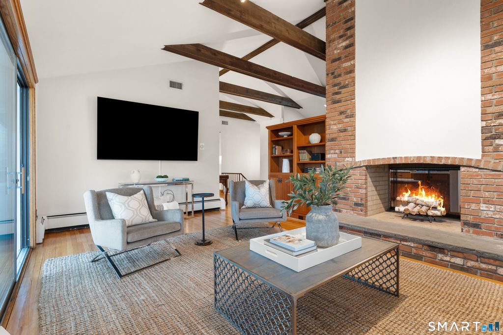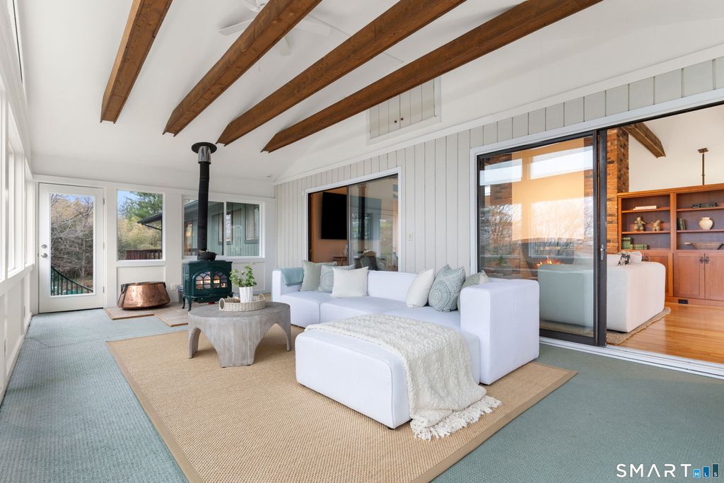 Light-filled contemporary retreat with a California vibe and sweeping sunset views, set on an lovely cul-de-sac. Designed for effortless indoor/outdoor living, this home offers over 3,500 square feet with open floor plan and natural light, vaulted ceilings, and walls of windows. The kitchen, dining room, and living room are thoughtfully arranged around a striking two-sided fireplace, creating a central focal point and seamless flow for everyday living and entertaining. Rich architectural character and warm wood detailing are carried throughout the home, including wood floors, coffered ceilings, and custom craftsmanship that add depth and texture. Multiple flexible living spaces provide room to gather and unwind, complemented by a dedicated oversized office, as well as convenient laundry and mud room areas. A recently rebuilt sunroom with new windows and wainscoting, along with a huge screened-in porch, extend the living space and offer bright, welcoming and comforting spaces. The lower-level family room features a dramatic fieldstone fireplace, while a private balcony off the primary suite adds another peaceful escape. Outdoor living includes a spacious bluestone patio and oversized fire pit, ideal for entertaining or quiet evenings under the stars. Recently updated with a new septic tank, new well head, refrigerator, freshly painted interior and exterior (2026), it's a rare opportunity to enjoy a home rooted in nature, and a delight to experience, just ten minutes from town