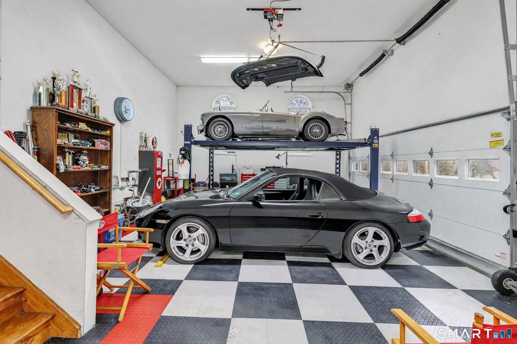 Welcome to this car enthusiast's dream at 170 Whippoorwill Lane In Stratford's desirable Putney neighborhood. This property overlooking the Mill River Country Club golf course is seated well above the road on a 3.53 acre lot providing park-like grounds and plenty of privacy. There are 12 rooms, 4100 square feet, 9 foot ceilings througout and a 4/5 car garage. Approaching the home via a long shared driveway, you are welcomed by a large parking area for 8 cars and a 4/5-car garage. The garage features RaceDeck flooring, a four-post hydraulic lift (negotiable), two 220 volt outlets, a utility sink, hose bib, 14 foot ceiling, a central-vac connection, compressor with extensions, and a convertible top lift. An in-ground 500-gallon propane tank heats the garage and runs the whole house generator installed in 2025 which can supply power for at least a week or more. Above the garage is a spacious, light-filled studio/office complete with a conference area, mini-split heating/cooling system and abundant storage closets - ideal for remote work, creative pursuits, or a private retreat.