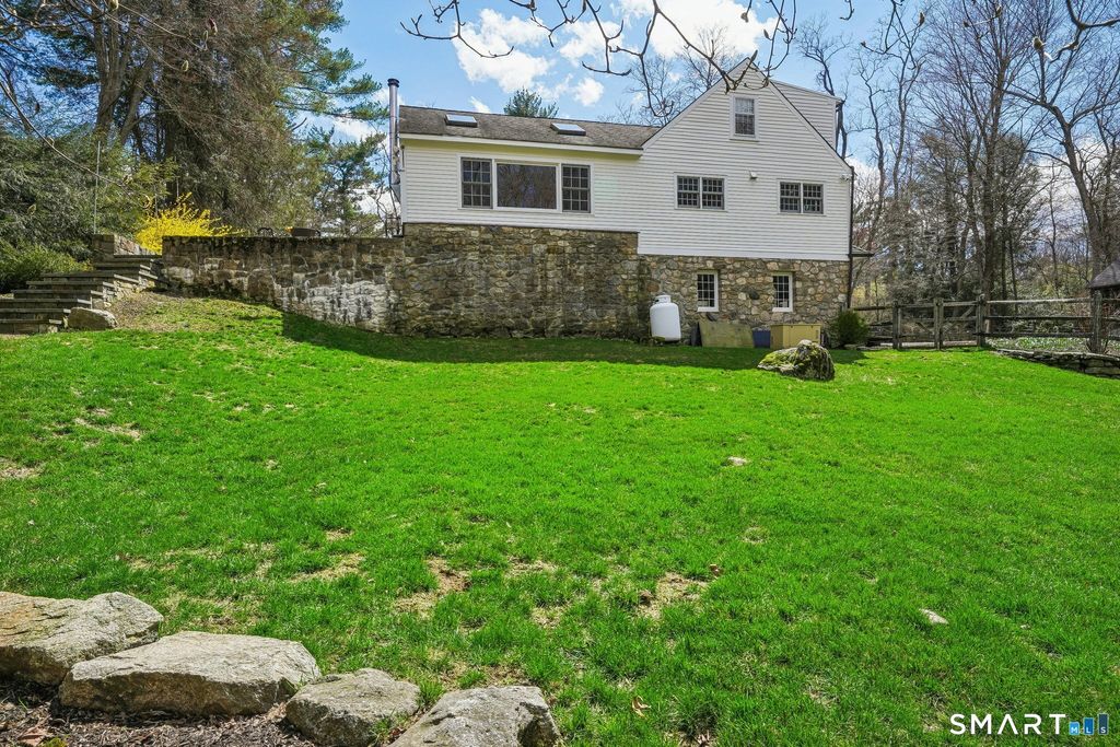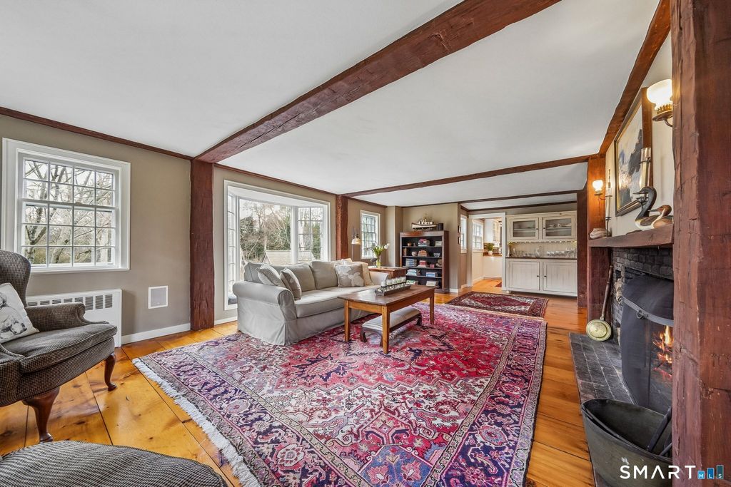 Unique "Antique" Expanded Cape, brimming with charm and character, featuring wide-plank wood floors, wooden beams and three working fireplaces. The spacious living room and dining room flow into an eat-in "country-style" chef's kitchen, offering double sinks, double dishwashers, two wall ovens and custom cabinetry; along with a wetbar, just around the corner, perfect for dinner parties and/or your morning coffee station. The vaulted ceiling family room with wood burning stove leads way to a stone patio with six-person hot tub; the perfect end to a long day! Home office with built-ins, first floor bedroom and a full, updated bath make entertaining a breeze. Upstairs, you'll find three generously-sized bedrooms, including a primary suite with its own full bath, double sinks and radiant heated floors. Additional updates include: New C/A (2024), Exterior Paint (2024), Interior Paint (24'/26') Kitchen Appliances (23'/24'/25'), First floor shower (2025). Two-car attached garage, abundant storage space, copper gutters, exterior shed and professionally landscaped grounds with seasonal blooms, make this the perfect countryside retreat. Private access through the rear, fenced-in yard to Cherry Lane Park, a 50-acre town park with walking trails and pond. Conveniently located with easy access to the Merritt Parkway, Route 7 and I95, and minutes away from Wilton Center and Downtown Westport make this a rare opportunity, you don't want to miss. Schedule an appointment to preview tod